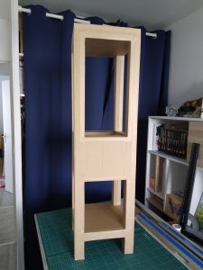 Solution: création d’une colonne avec un arrondi des étagères à gauche permettant d’ouvrir la porte d’entrée sans la cogner sur le meuble. La bannette en bas sert à ranger les bottes en hiver.